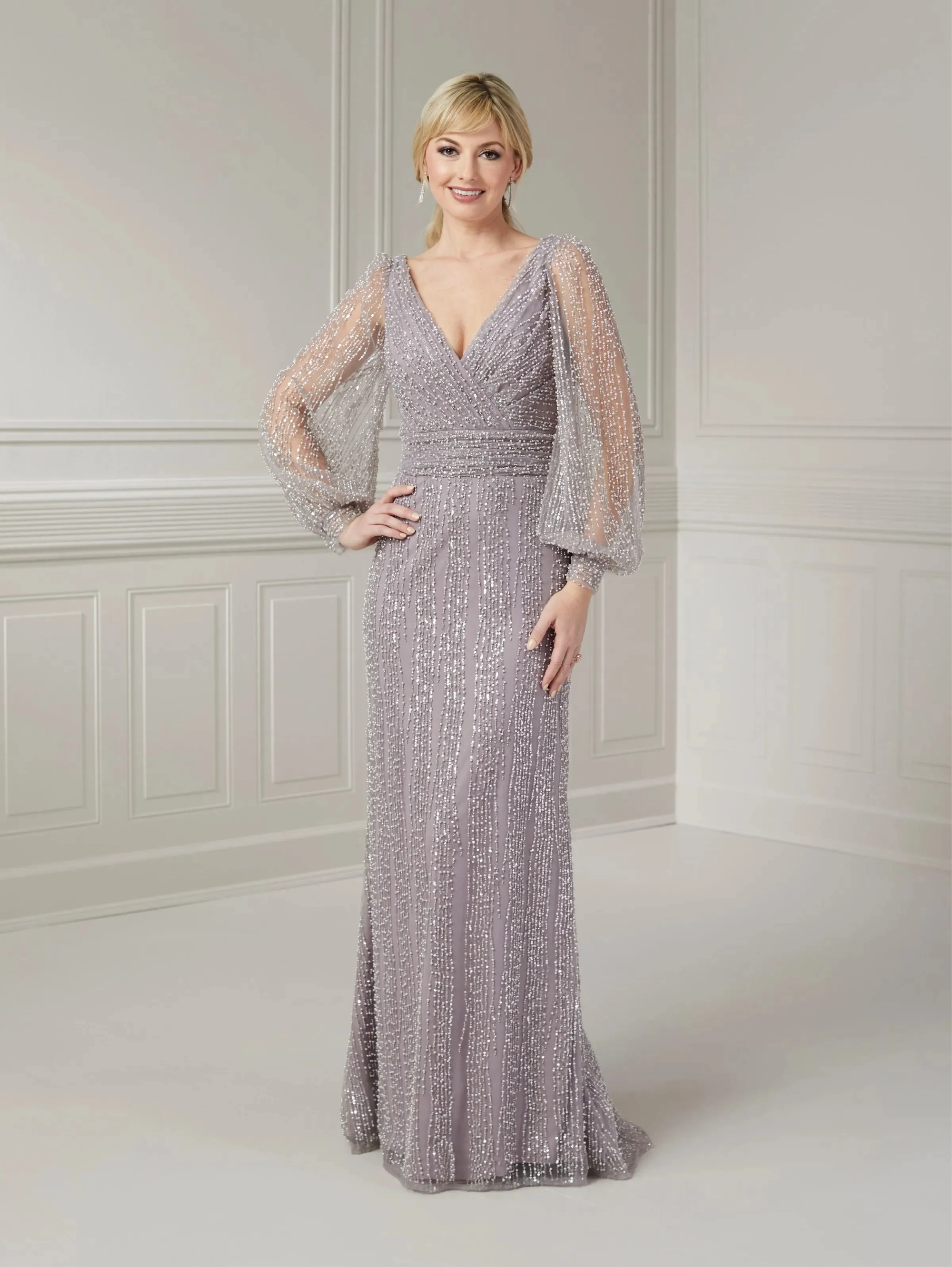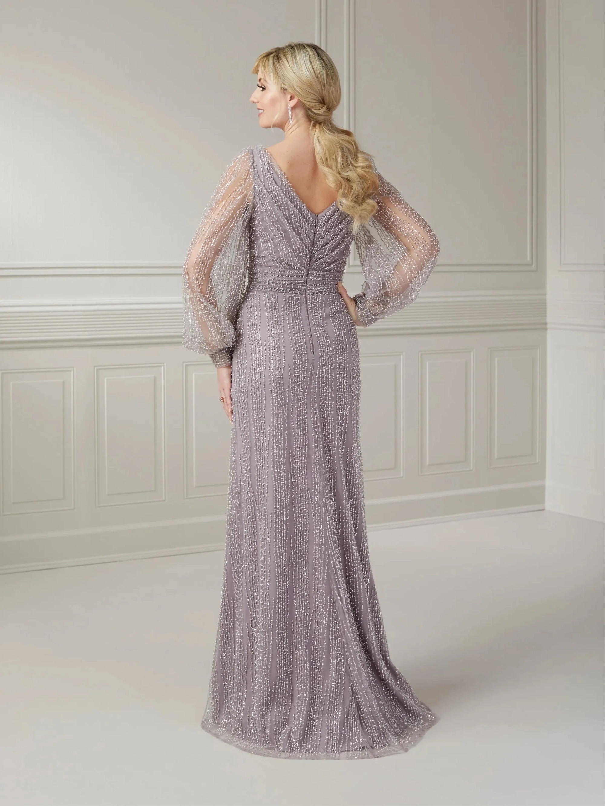 Simply dazzling, the stunning gown features all-over baby sequins and beads designed and laid out in a liner pattern. The surplice bodice makes a deep V-neck, that leads to a horizontal embellished waist and slim skirt. Illusion beaded puff and cuffed long sleeves add a bit of drama. Finished with a V-back and sweeping train.