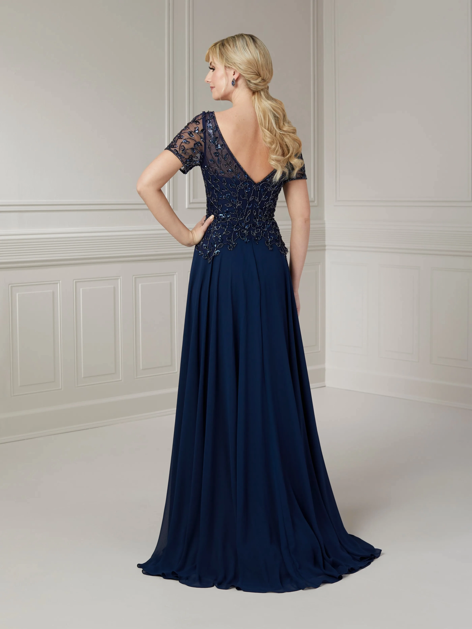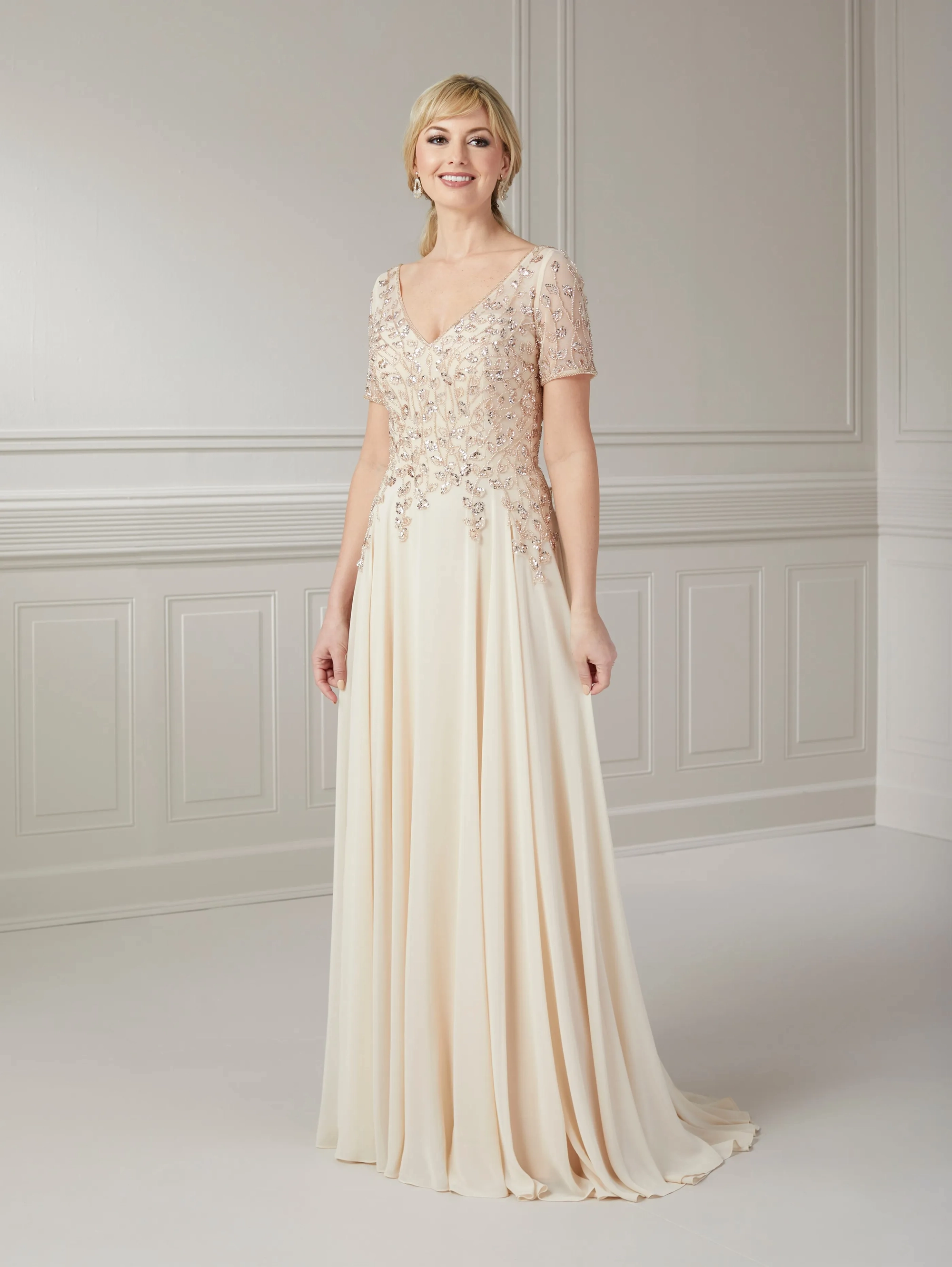 Beautiful chiffon ballgown features a stunning allover beaded bodice that trails past the natural waist. The double V-neck front and back highlight illusion shoulders that extend to sheer embellished sleeves. A double row of fine beads frames the neck and sleeve hem. The fluid A-line chiffon skirt is full and graceful and finished with a sweeping train.