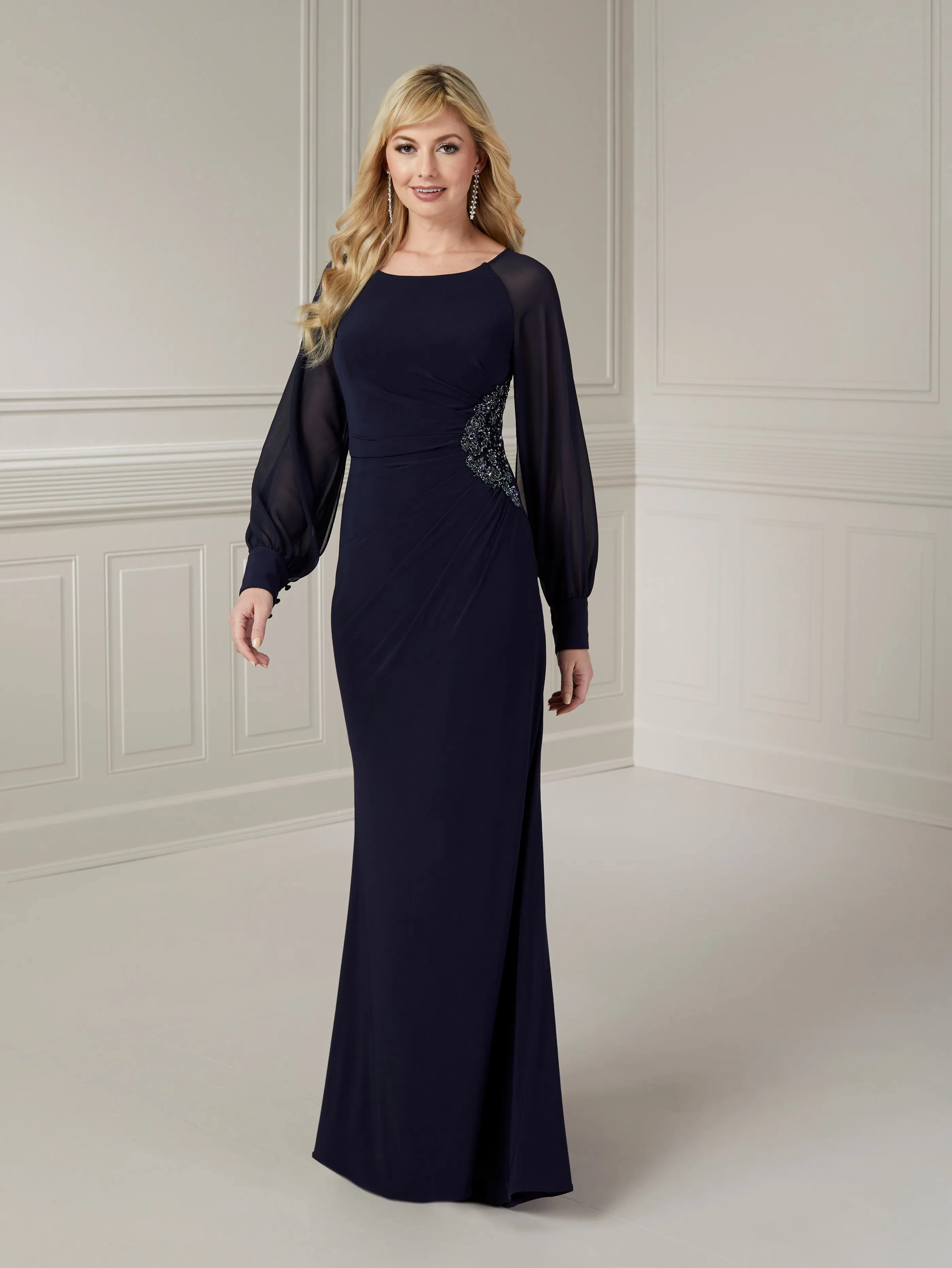 Stunning slim jersey gown features a high scoop neckline and raglan style long sheer puff sleeve that are cuffed. The front bodice and skirt feature side pleating that leads to a beautiful, beaded side waist feature that accentuates the waist. A subtle sweeping train finishes the look.