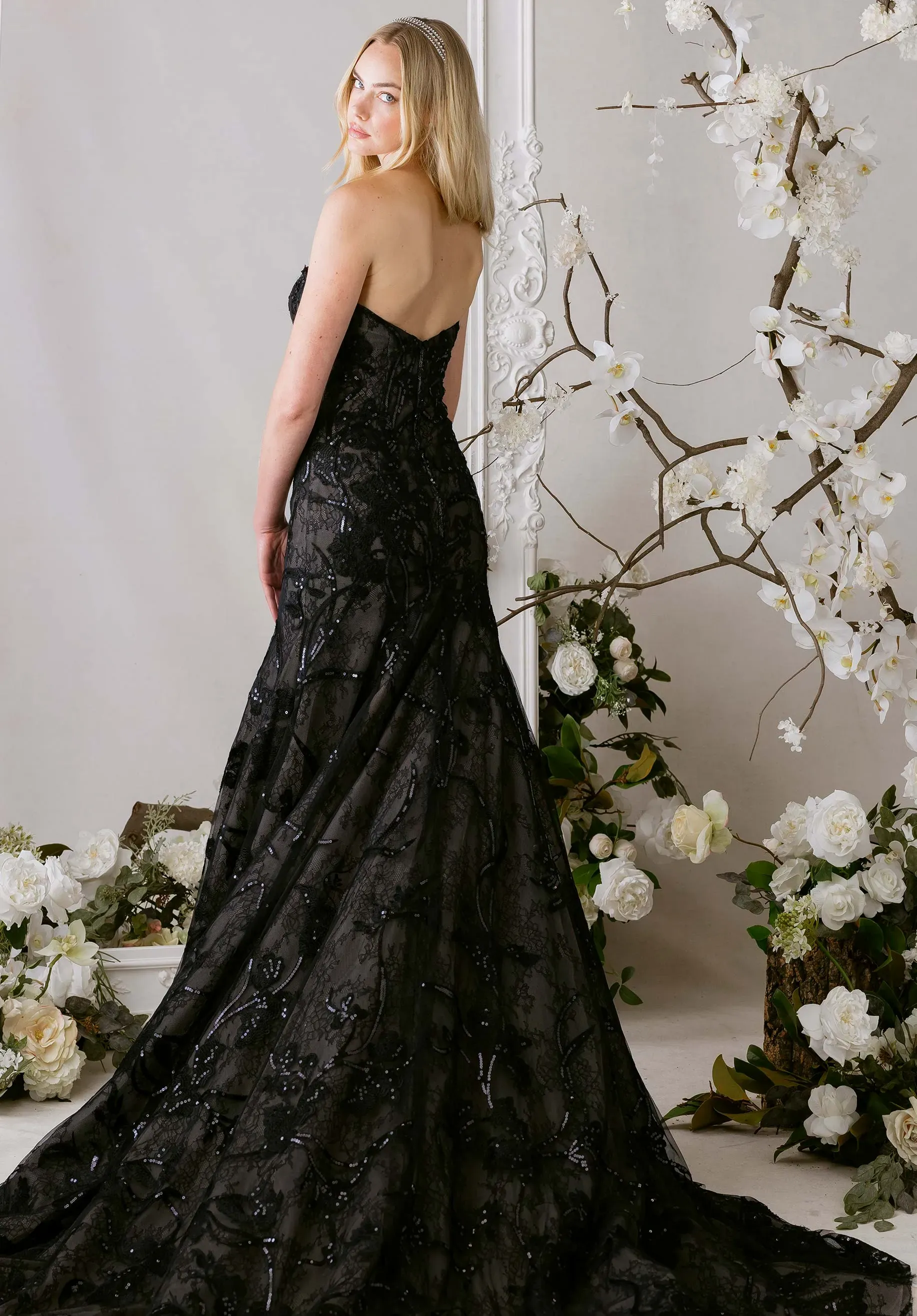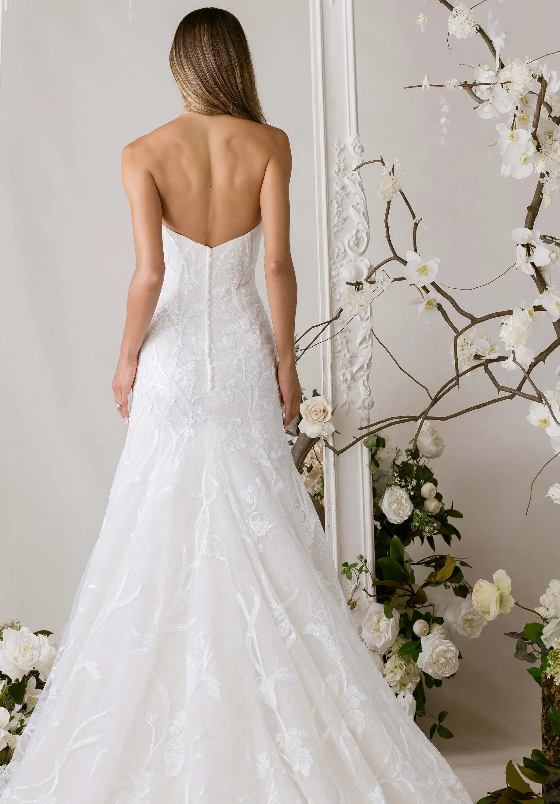 Sleek like the lines of an arabesque, our Menagés wedding dress is a fit and flare that exudes soft, romantic elegance. The strapless neckline has a delicate sweetheart shape, framing the décolletage with gentle curves. Sequin and bead embroidered floral appliqués trace swirling lines over the silhouette, drawing the eye down the Chantilly lace gown, catching the light with every movement and radiating beauty.