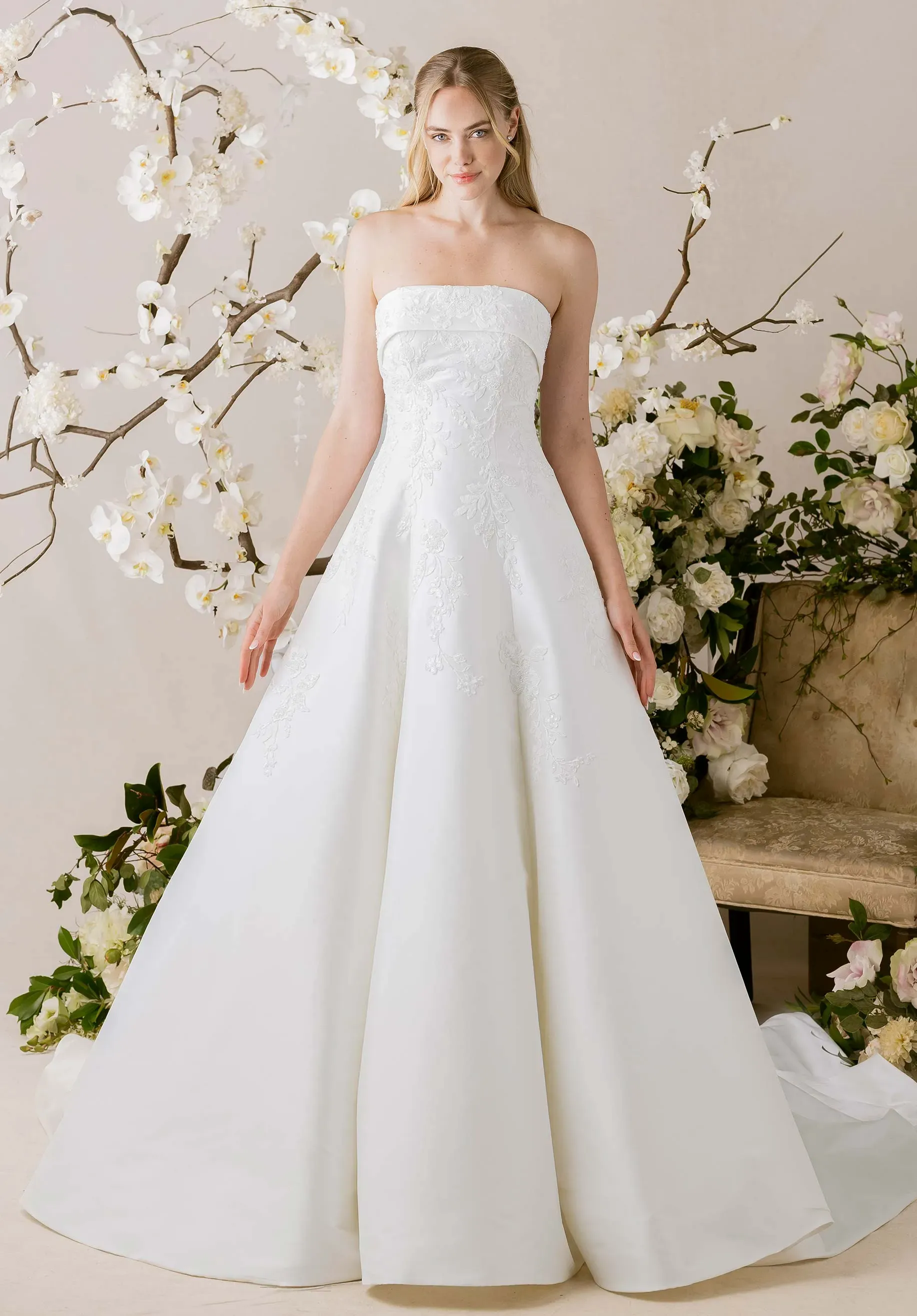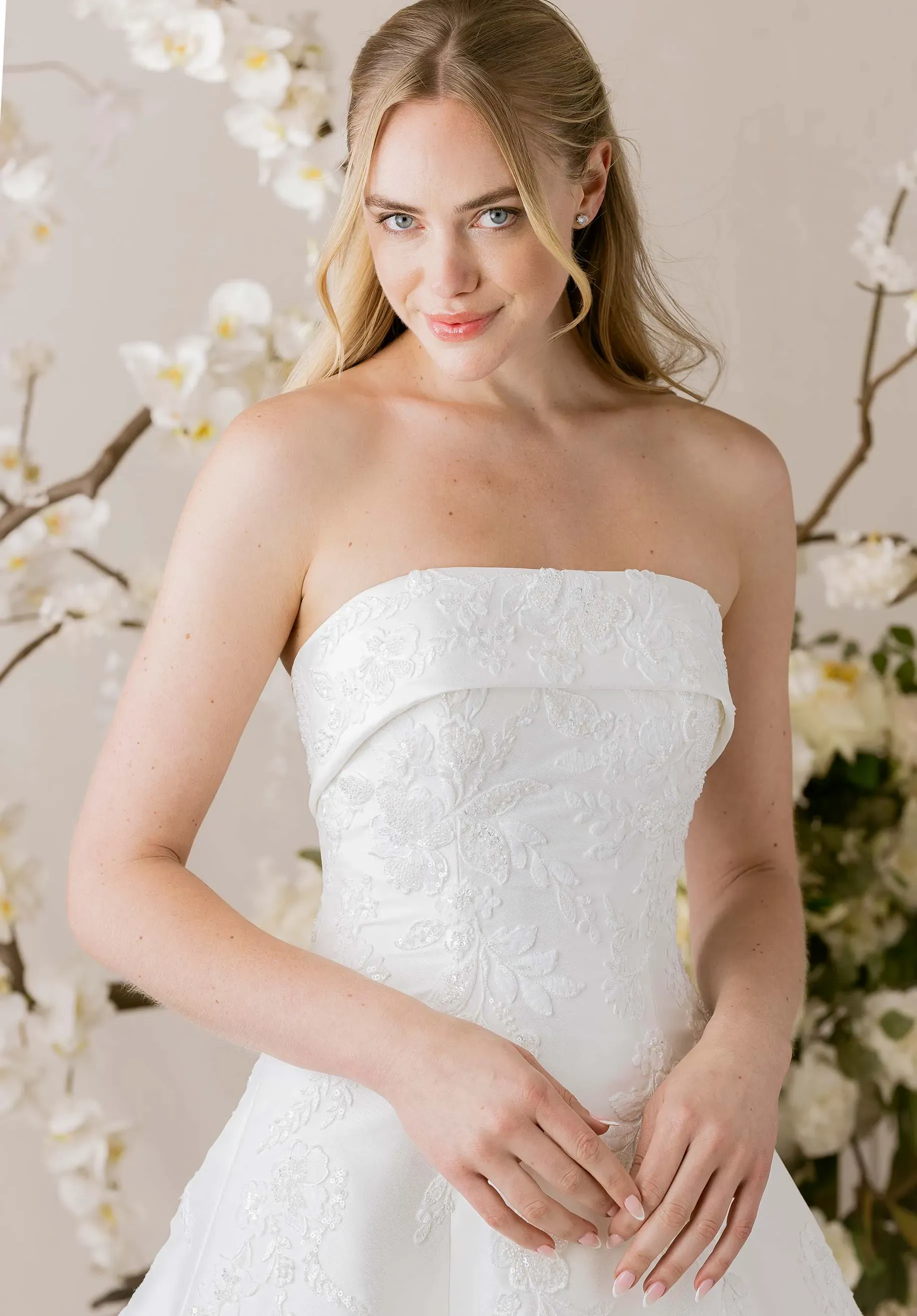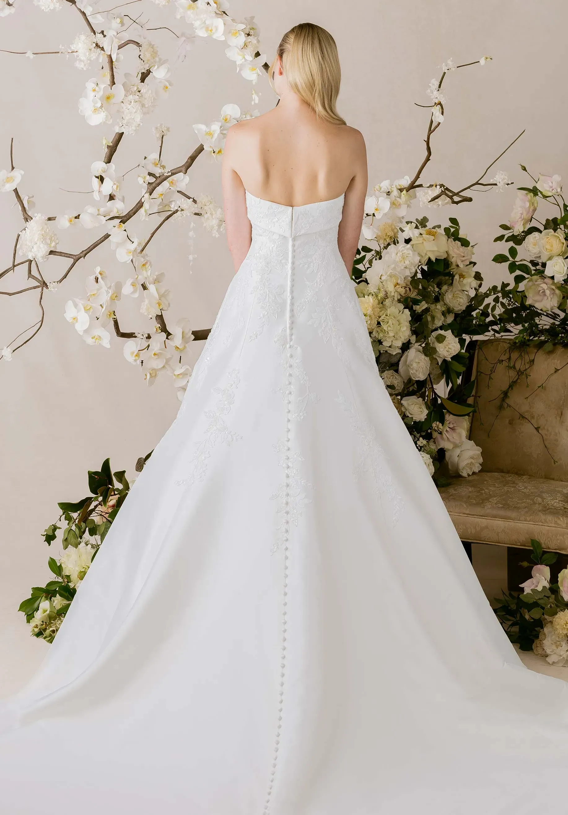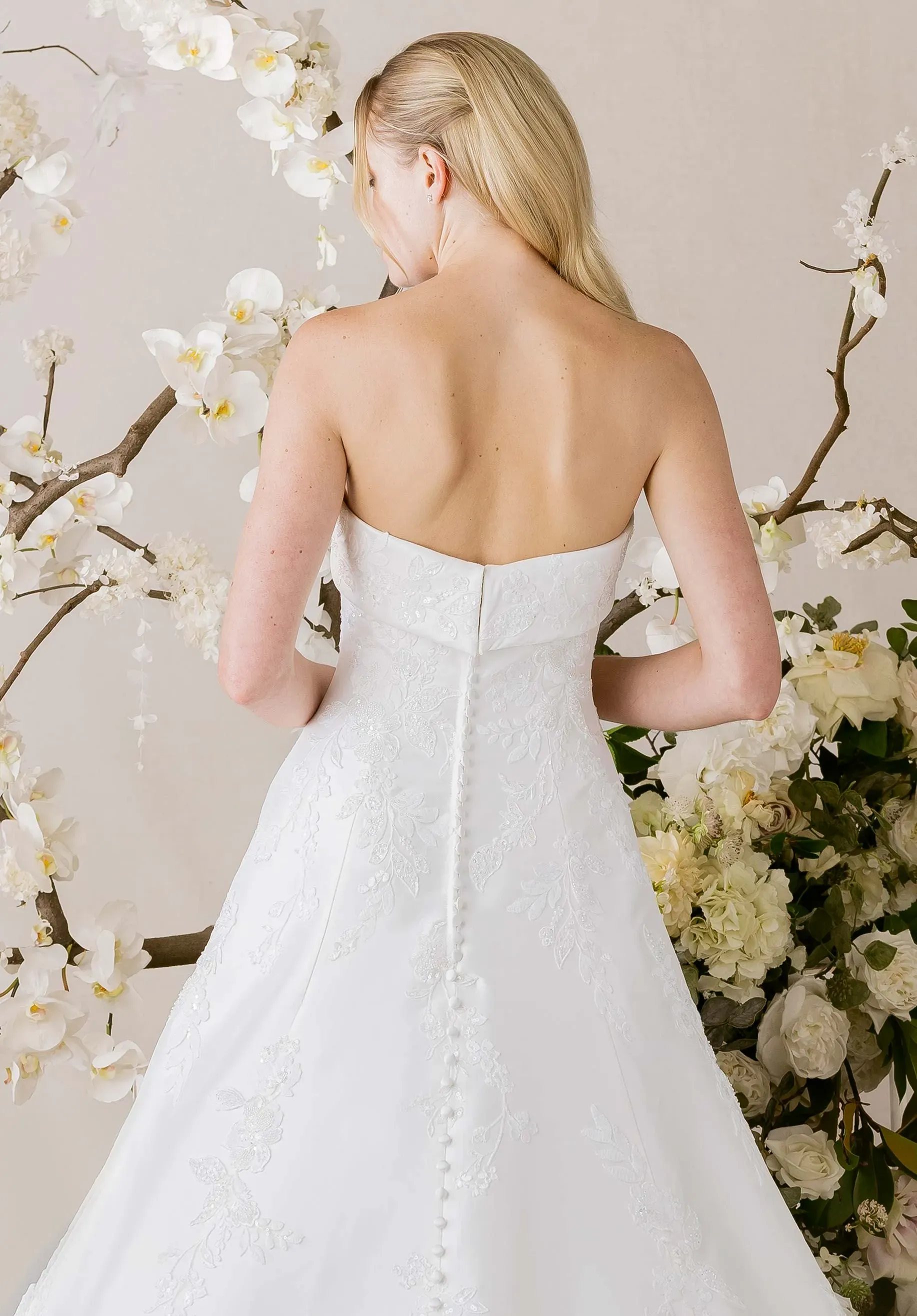 Elegant in its simplicity yet rich in detail, our Isadora wedding dress exudes refined grace. The strapless cuffed neckline and sculpting princess seams create a timeless silhouette, while cascades of beaded lace shimmer delicately across the Mikado A-line. Buttons trailing down to the hemline add a touch of classic romance, completing a look that moves with quiet sophistication and modern poise.