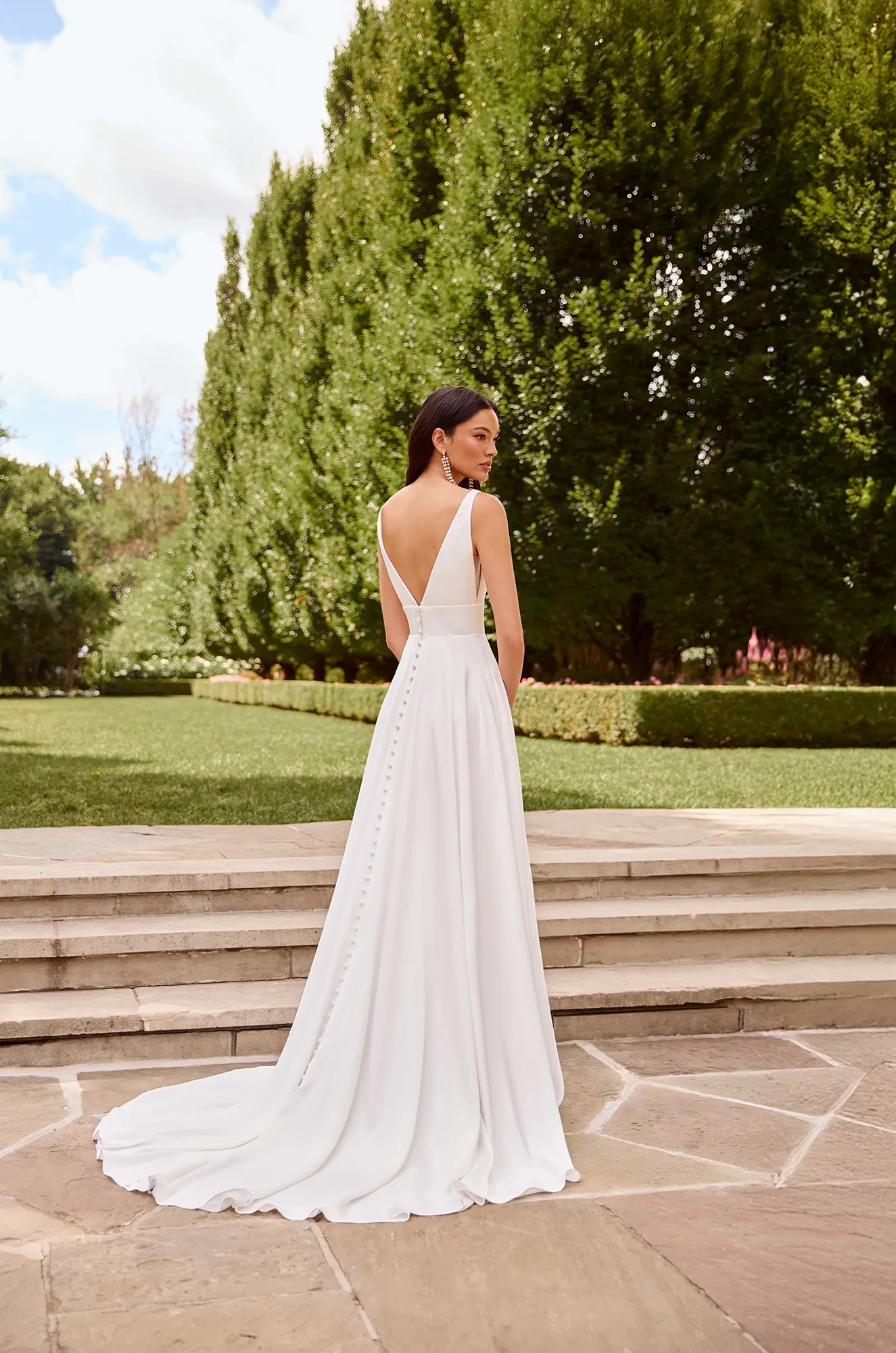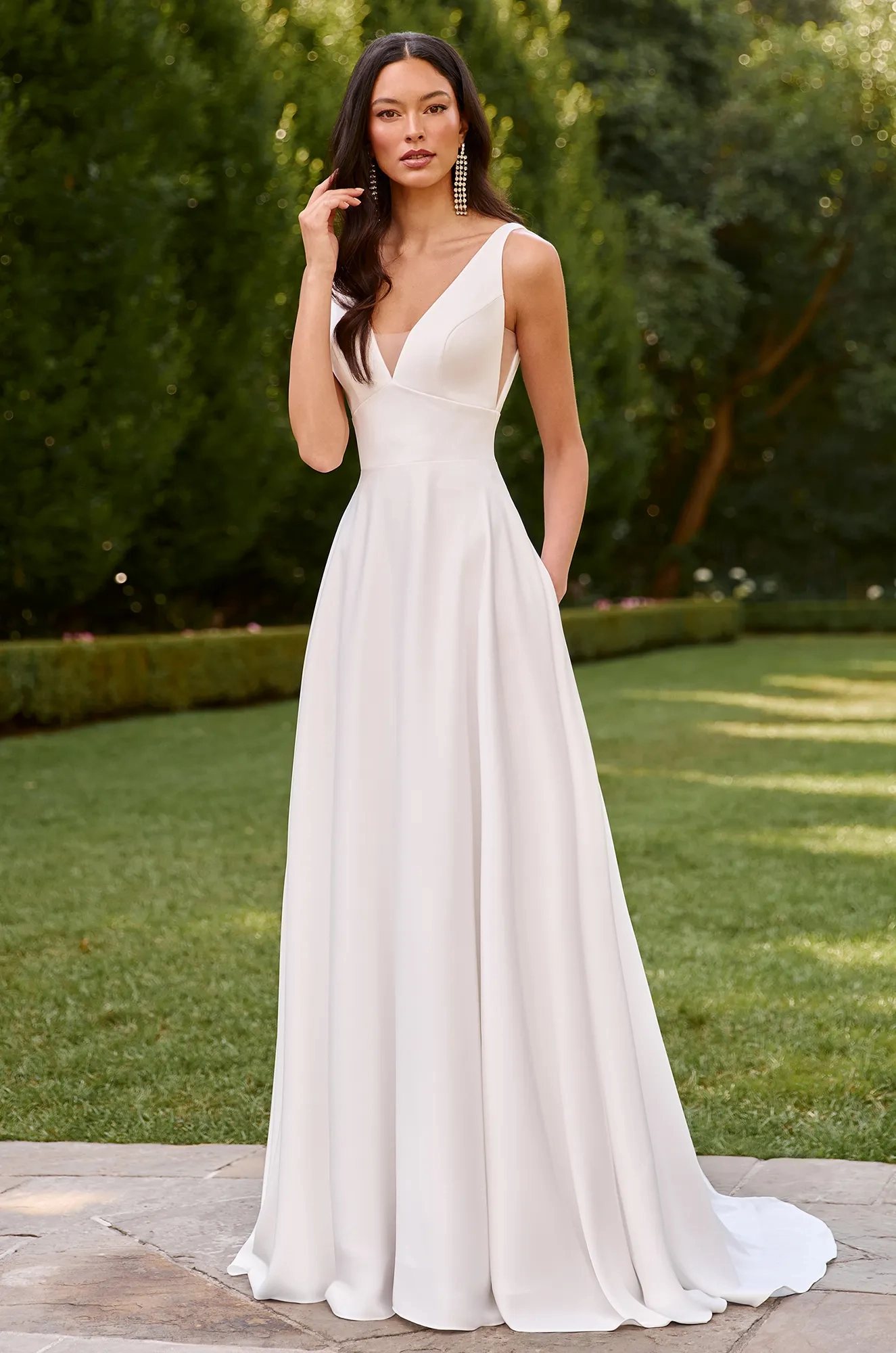 Sleeveless Charmeuse Satin bodice with plunging V-neckline, Natural Italian Tulle side inserts, and empire waist seam on bodice. Charmeuse Satin A-line skirt with pockets and fabric covered buttons down center back of skirt to hem. Train length is 18"