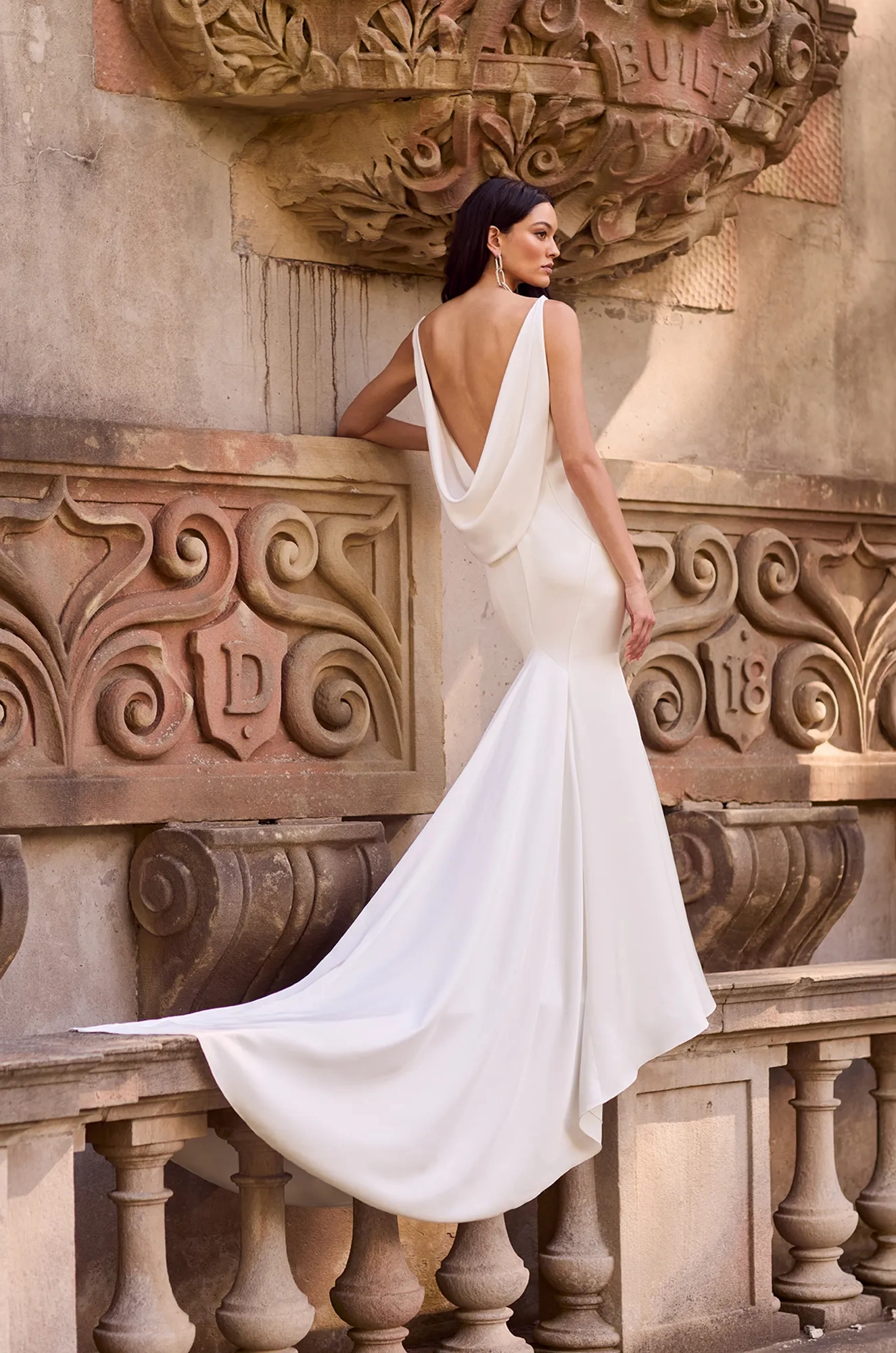 Sleeveless modified princess cut gown with V-neckline and back spaghetti straps. Low open back with detachable cowl. Fit and flare skirt with inverted seam at back of train. Train length is 24".