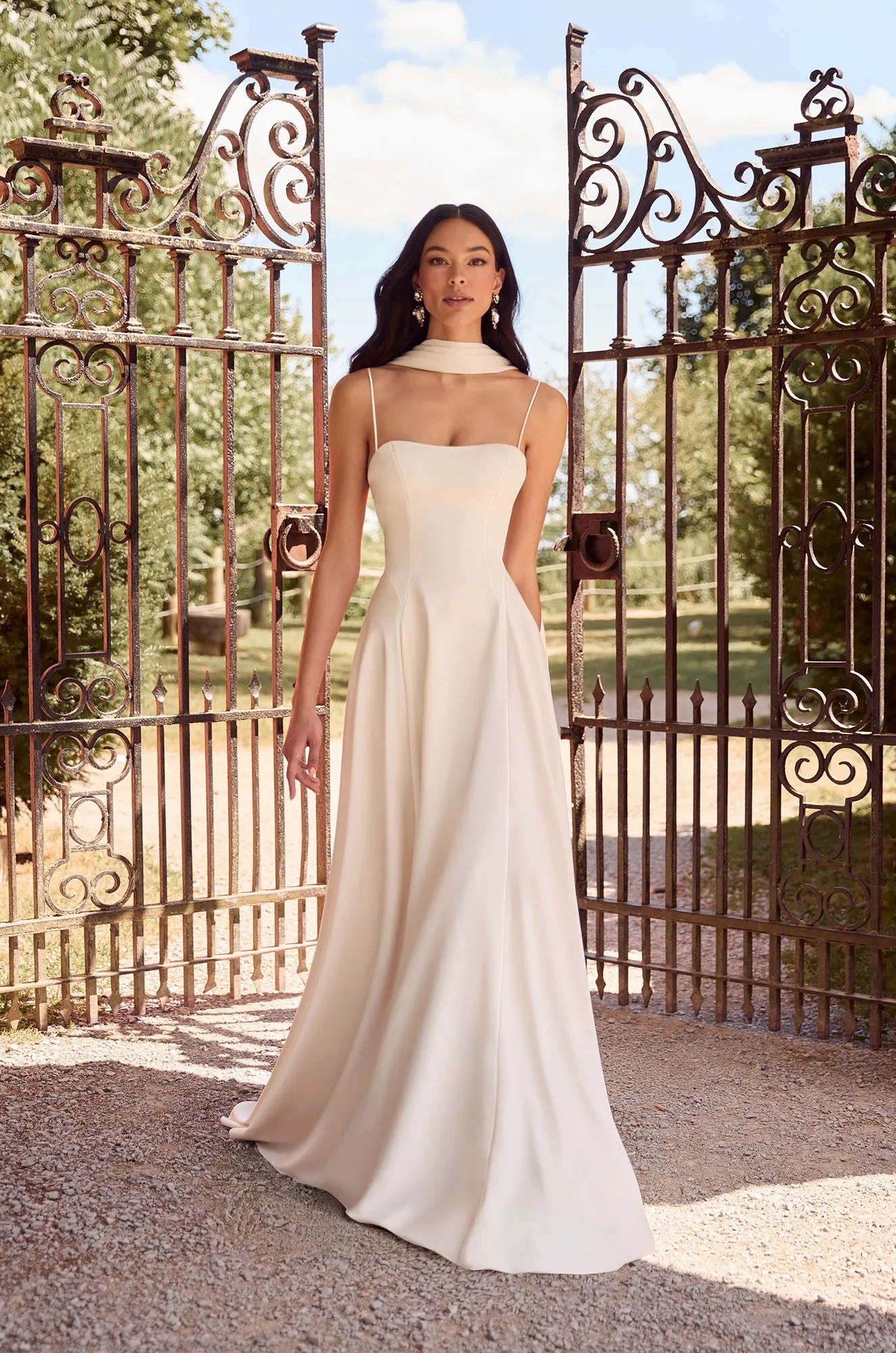 Princess cut gown with scoop neckline, spaghetti straps, and scarf. Full A-line skirt with side godets. Fabric covered buttons down center back of skirt to hem. Train length is 24".